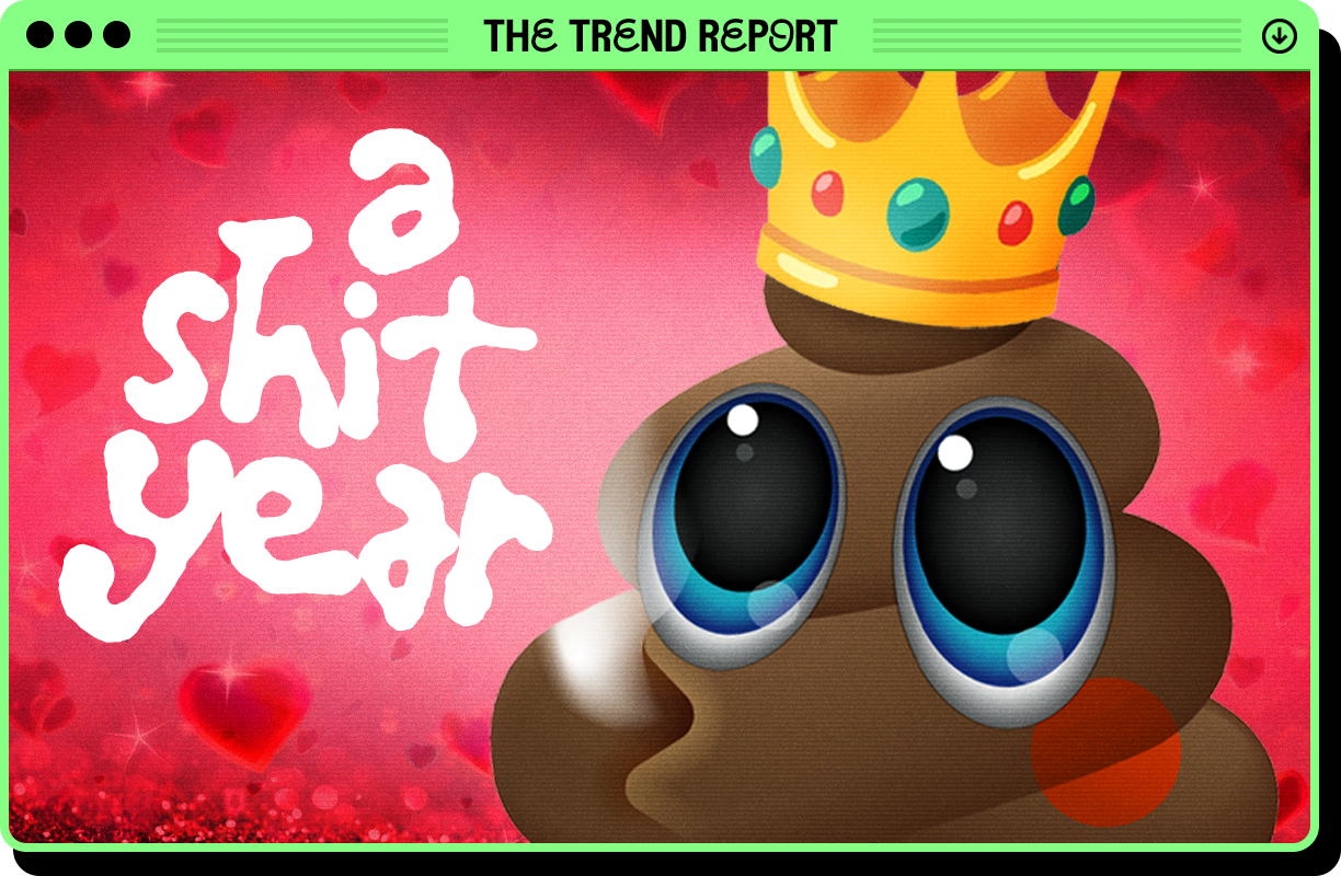 The words of the year (“rage bait,” “6-7,” “slop,” “parasocial,” “glut,” “fatigue”) reflect a techno-induced mania and, while my intellectual mind says the word of the year is “dehumanized,” my monkey brain says we can go one further with this year’s word: shit. Poop. Fart! Doo doo. Logs. Wee wee poo poo dookie butter brownie pudding dump: that was the year. Not just because of the news, but because trends were repeatedly shitsessed — “SDIYBT,” “Things me and my boyfriend have stuck up our butts,” “Take a picture with your ass out,” “Calzolzini Cacadini” and “Pañalini Caquini” — along with various breakout stars of the number two variety, like the Afraid To Fart woman and Hally, the certified pooper and Tiara “Can you spell diarrhoea?” Skye. “If I eat your ass crack, no sloppy Joe in the back,” Cupcakke rapped in October, yielding the viral “Monday, eat my ass; Tuesday, eat my ass” and so on, eating ass every day except Sunday, the day when one must fast from ass. While protein had a breakout year, it birthed this fibrous now: we became so constipated with thoughts, ideas, and edible content this year. 2025 saw the last hurrah of tech loneliness and digital ennui as we realized we need to start taking a communal, cultural laxative. Continuing the 2020s trend of maintaining your colon health, we’re hopefully entering an era of being more regular, for the better health of our hearts and minds — and the better health of the planet’s heart and mind.