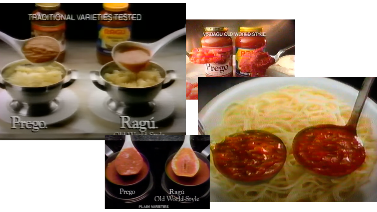 âSomebodyâs saying theyâre thicker than one of the RAGĂ sauces,â a RAGĂ commercial from 1990 went, before pouring both sauces onto noodles to show how RAGĂ offered thicker, richer taste for your pasta. Prego didnât take this sitting down, releasing a commercial in 1991 where two pots of sauces took the slotted spoon test, where Prego sauce spoon stayed in the spoon as RAGĂ sauce leaked through the slats, back into the pot. The debate continued and continued, RAGĂ insisting that it offered more authentic, âold worldâ sauce while Prego asserted âold worldâ didnât mean traditional, which is to say: their recipe included diced tomato instead of tomato paste. The competition was a fierce one but ultimately ended with a take that Prego had been hammering since the late eighties, which was captured most directly in a 1995 commercial including colanders: two heaps of spaghetti sit in silver bowls with holes at the bottom, both placed on white plates. âWhy does Prego taste better than RAGĂ old world style?â the narrator asks. Sauce is poured over the pasta. âIt probably has a lot to do with all Prego goes through to make sure itâs thicker and more delicious,â the voice continues. Hands pull back the bowls, revealing what could be seen as one of the most damning images in food advertising: the plate beneath the bowl of Prego was clean and white while RAGĂâs plate was red and watery as all the sauce was leaking to the bottom of the plate.