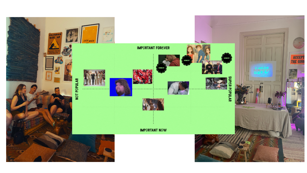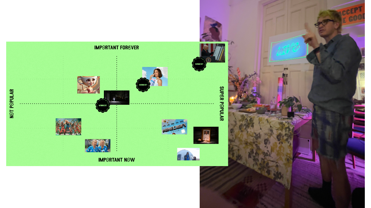 I describe it as a game show where, as a group, we work together to build a time capsule of this moment by figuring out how important and popular items are, by mapping them on a matrix of those two metrics. We map fifteen items — five news, five pop culture, five memes — that take the tried and true weekly newsletter format and applies it to the month. Each item is debated, less about the subject itself and more as an impartial analysis, to make the case for it being very important (It will be in history books!) or not-that important (It’s akin to a TikTok trend!), more popular (Your mom and grandma know about it!) or less popular (Only industry insiders know about it!). Our assessment is neither good nor bad but just is: anywhere on the TRL matrix is valid as it is a means to help us process these times, to understand how these little moments may fit in the whole of history. At the end of the night, each of us vote on our top three happenings of the month — and the three items with the most votes are the most memorable items for the month.